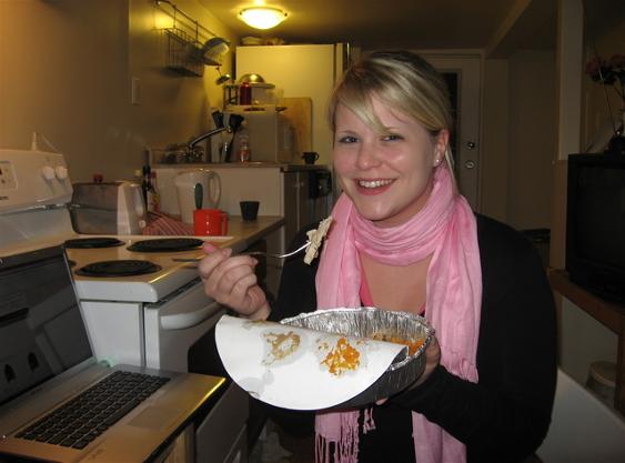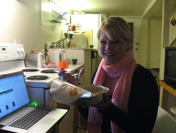 Irgendwann kam dann Adrian, unser anderer Mitbewohner nach Hause...und was hatte er im Gepäck....Essen von Mama!!! ----> Truthahn mit Füllung, Kartoffelbrei und Kürbismousse. Das musste ich einfach probieren und es war auch wirklich total lecker :-). Mal etwas ganz anderes und so kam ich doch noch zu meinem Truthahn..naja er kam zu mir, aber ihr wisst schon was ich meine :-). Und nun ist der Tag fast zu Ende...wie immer verging er total schnell.