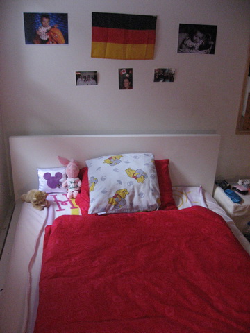 Mein Bett..(1,40m breit...Ja!!)....natürlich mit einem Winnie Pooh Kissen, meinem Glücksstofftier Ferkel, dass mich auch schon durch mein Abi begleitet hat und meinem Löwen, den ich noch am Flughafen von Ralf und Tanja bekommen habe, um Braunschweig und mein Zuhause nicht zuvergessen...:-)